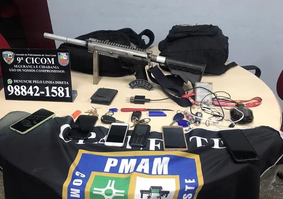 Foi feito a verbalização com os infratores que acataram as ordens da guarnição, a equipe fez a revista do veículo onde constatou uma arma longa caseira fuzil, 6 celulares , uma arma branca , mochilas , um cordão de cor amarela.