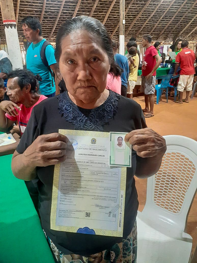 Aos 71 anos, a agricultora Doroteia Carlos emitiu a certidão de nascimento e a primeira via do RG. Ela é do povo Baniwa, residente na aldeia Trindade, em São Gabriel da Cachoeira (a 852 quilômetros de Manaus), e foi uma das 430 beneficiárias pela ação do Governo do Amazonas, que está levando os serviços cidadania a indígenas aldeados na calha do rio Negro.A