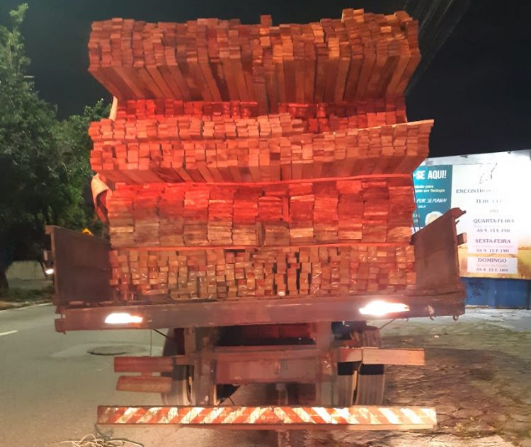 Após receber denúncia, os policiais abordaram o veículo e, em seguida, identificaram o conteúdo da carga transportada, aproximadamente 36m³ de madeira serrada. O responsável pela carga estava sem o Documento de Origem Florestal (DOF), dessa forma caracterizando-se a irregularidade.