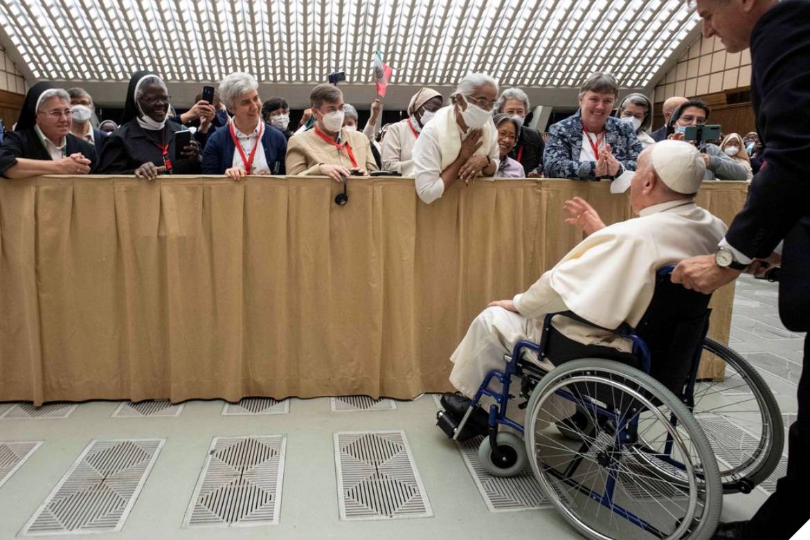 Em uma audiência com um grupo de freiras na sala de audiências gerais do Vaticano, Francisco foi levado para seu assento no palco. Um assessor então o ajudou a sair da cadeira de rodas e a se sentar.
