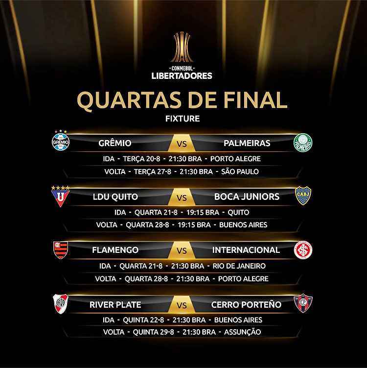 🗓️🏆 Tabela confirmada! As datas e horários das quartas de final da CONMEBOL #Libertadores.