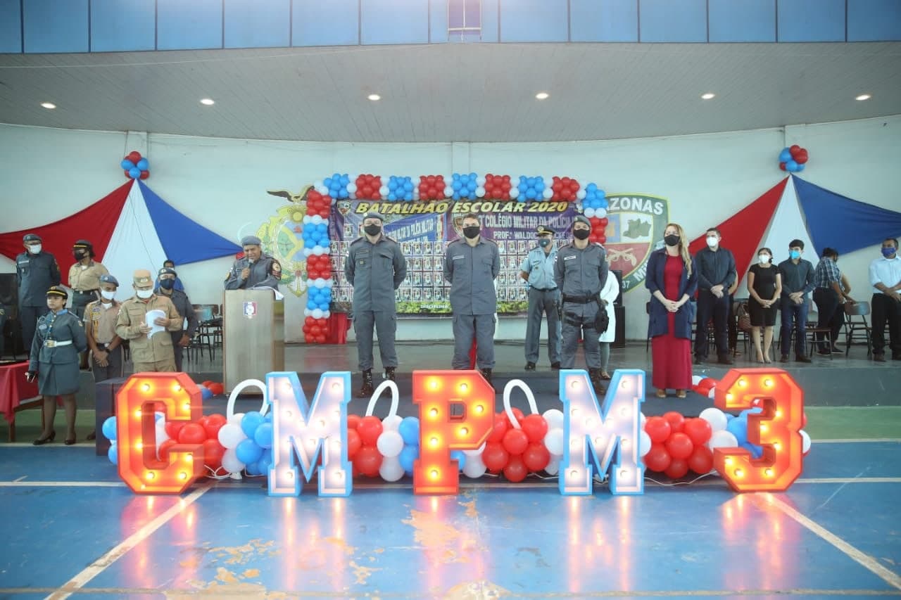 A Polícia Militar, juntamente com a diretoria do Colégio Militar da Polícia Militar III (CMPM III), realizou solenidade alusiva ao Batalhão Escolar ano 2021 e formatura da Legião de Honra. O evento ocorreu nesta sexta-feira (28/05), na quadra de esporte do colégio, situado na rua Elisa Lispector, bairro Parque São Pedro -Tarumã, zona oeste de Manaus.