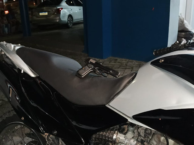 Durante a abordagem policial, um deles reagiu e foi baleado, e o comparsa na tentativa de fuga, acabou colidindo a moto com a viatura e foi preso. Com eles a polícia apreendeu uma pistola 765 com 03 munições.