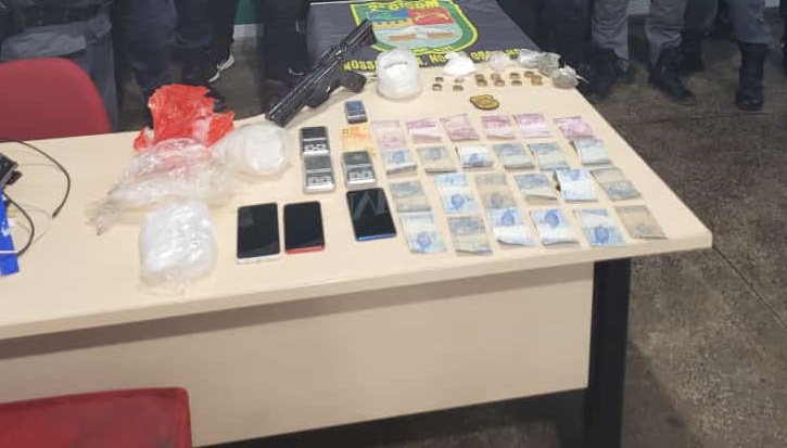 Na revista pessoal, foram encontradas três porções de maconha, do tipo skunk; duas porções de cocaína; e uma de oxi, além de um simulacro de arma de fogo; balanças de precisão e dinheiro.