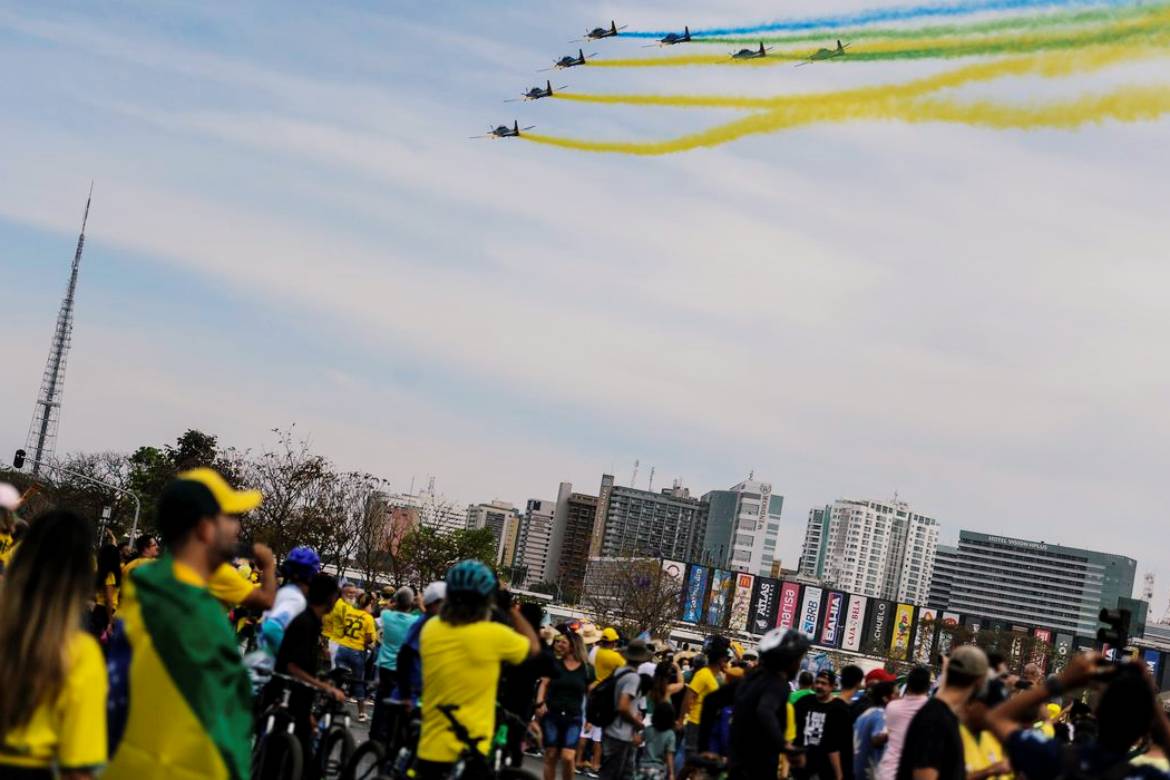 Uma multidão se espalhou pelo gramado da Esplanada durante o desfile, sem conseguir acessar as arquibancadas já lotadas. No meio do público, avistavam-se faixas com críticas a ministros do Supremo Tribunal Federal e ao comunismo.