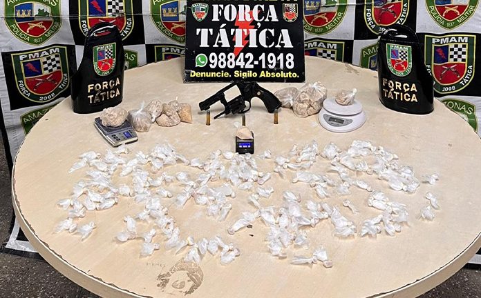 A Polícia Militar do Amazonas (PMAM), por meio da Força Tática, apreendeu entorpecentes e uma arma de fogo na madrugada deste sábado (10/01), no bairro Jorge Teixeira, zona leste de Manaus.