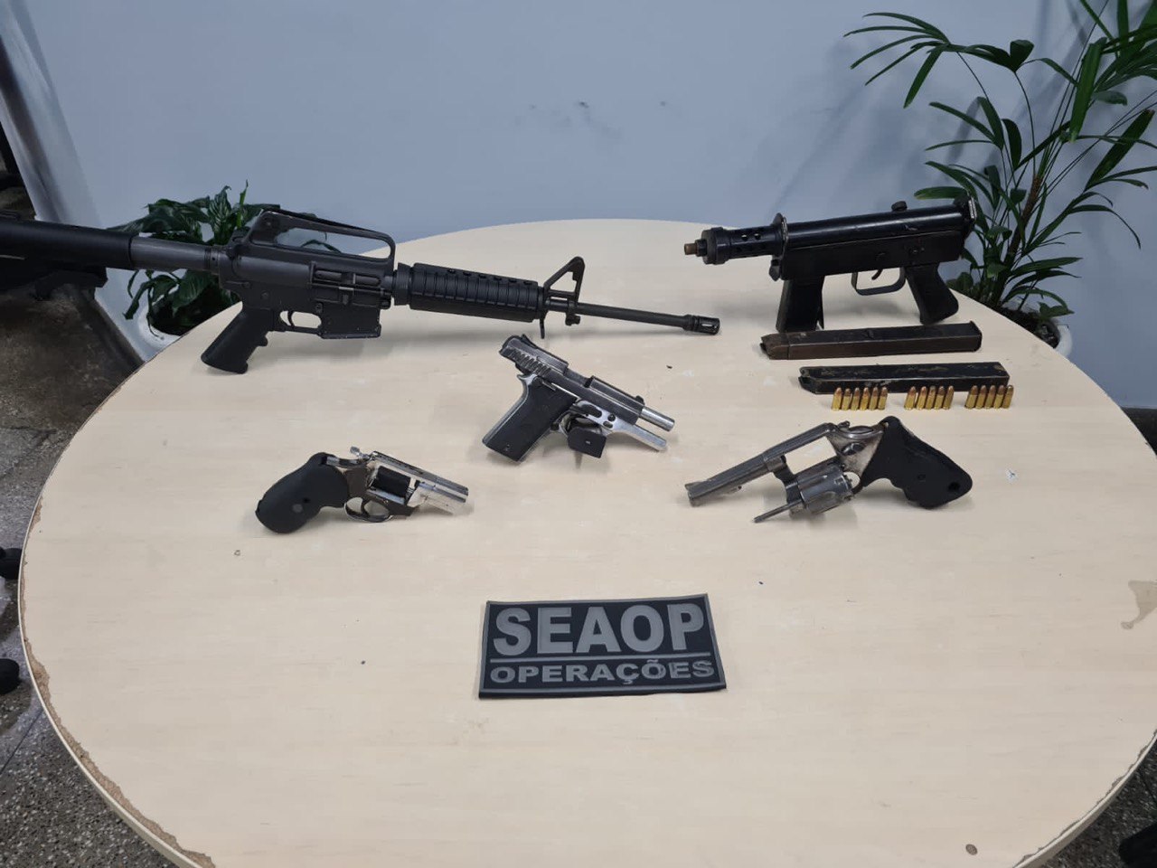 Ao todo, foram apreendidos dois revólveres calibre 38, uma pistola calibre 380, uma submetralhadora e um fuzil AR15, além de 16 munições. Os dois infratores foram conduzidos, juntamente com o material apreendido, ao 14° Distrito Integrado de Polícia (DIP).