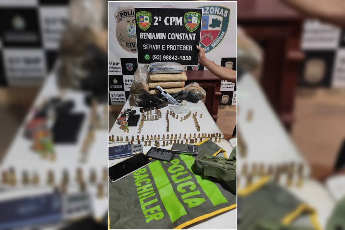 Os agentes apreenderam cerca de sete quilos de maconha do tipo skunk, 226 gramas de pasta base, duas pistolas, dois carregadores de pistola, 98 munições de diferentes calibres, duas balanças de precisão e uma motocicleta.