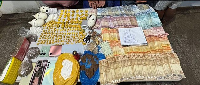 Com eles foram apreendidos maconha, cocaína e oxi, além de três balanças de precisão; R$ 3 mil em espécie; uma motocicleta Yamaha Lander cor preta e sem placa; quatro câmeras de vigilância e um caderno com anotações ligadas à contabilidade do tráfico de drogas.