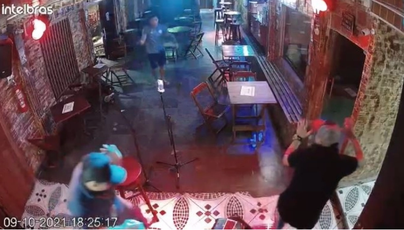 Câmeras de segurança registraram o momento em que o homem entra no estabelecimento já atirando para cima e gritando, questionava sobre o seu cartão.