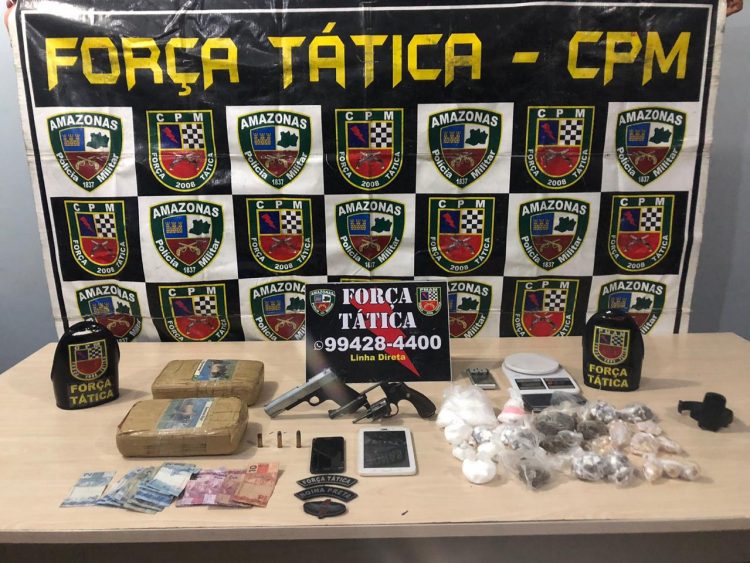 Policiais militares da Força Tática detiveram, na noite desta terça-feira (24/03), dois homens suspeitos de tráfico de drogas e porte ilegal de arma de fogo no bairro Santa Etelvina, zona norte da capital. Com eles os policiais apreenderam um revólver calibre 38, numeração 188735; três munições calibre 38, intactas; um simulacro de arma de fogo; dois tabletes de supostamente skunk; seis porções médias de supostamente cocaína; quatro porções médias de supostamente skunk; uma porção média de supostamente pedra de oxi; 60 trouxinhas de supostamente cocaína; 110 trouxinhas de supostamente oxi; 124 trouxinhas de supostamente skunk; um aparelho celular Samsung; um tablet Samsung; uma tornozeleira eletrônica rompida; e a quantia de R$ 98,00 em espécie.