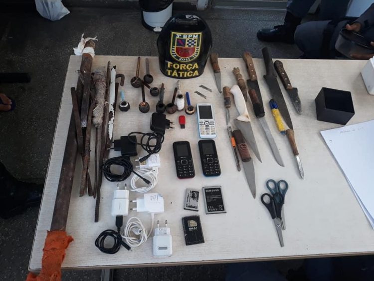 O Comando do 3° BPM desencadeou através de planejamento prévio a Intervenção Policial na Unidade Prisional realizando a varredura nas celas e obtendo como resultado final da revista a apreensão dos seguintes materiais: 12 armas brancas; 09 cachimbos de fabricação artesanais; 05 carregadores de celular; 01 pen drive; 03 baterias de celular; 01 celular BLU de cor branca; 01 celular BLU de cor preta com dois chips; 01 celular BLU de preta e azul com um chip; 06 estoques; 03 barras de ferro; 02 tesouras e material para embalo de cigarro.