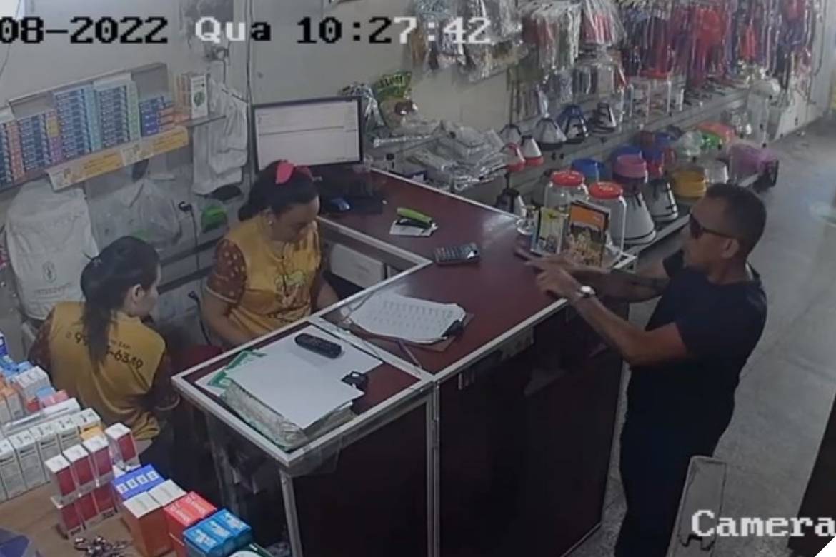 As imagens mostram o momento em que o suspeito entra na loja, retira a arma de dentro da calça e anuncia o assalto para duas funcionárias. Ele roubou toda a renda do caixa, além de um cordão do pescoço de uma das mulheres que estão no local.