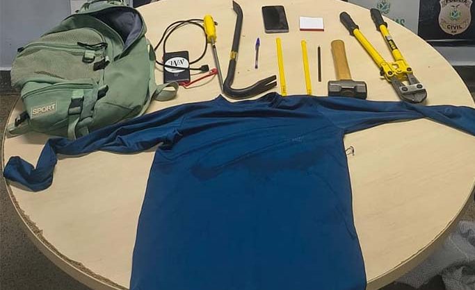 Durante a abordagem, foram apreendidos um aparelho celular; além de ferramentas que teriam sido usadas no arrombamento do estabelecimento comercial como: duas serras, um alicate, uma marreta, um pé de cabra. Bem como dois cabos USB e uma mochila preta. O suspeito e o material apreendido foram encaminhados ao 1º Distrito Integrado de Polícia (DIP).