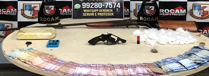 Foram apreendidos ainda um revólver calibre 38, uma espingarda calibre 32 e uma munição de calibre 32, além de um tablete de 1 quilo de cocaína e 358 porções fracionadas da mesma substância, prontas para comercialização. Também foram encontrados R$ 576,75 em espécie, uma máquina de cartão e uma motocicleta de placa TSD-9F44.