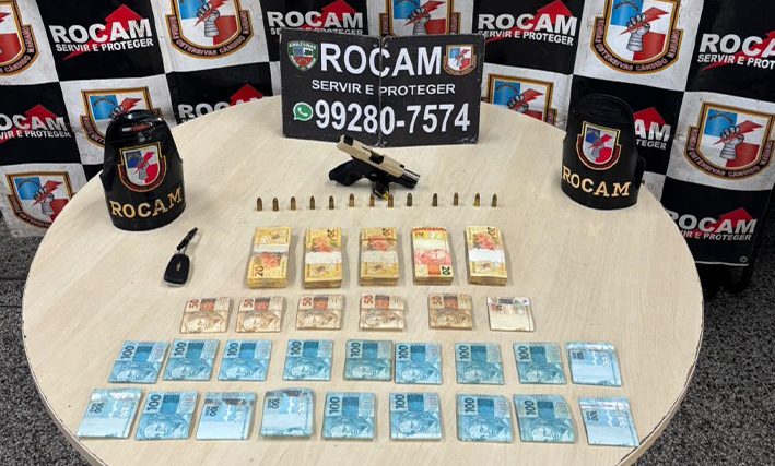 Imediatamente, os PMs iniciaram as buscas e encontraram o veículo com as características repassadas. Durante as averiguações, foi encontrado com o homem, dentro da picape, uma arma de fogo calibre 9mm, modelo G2C, com 13 munições intactas, mais a quantia de R$ 32.450 em espécie.