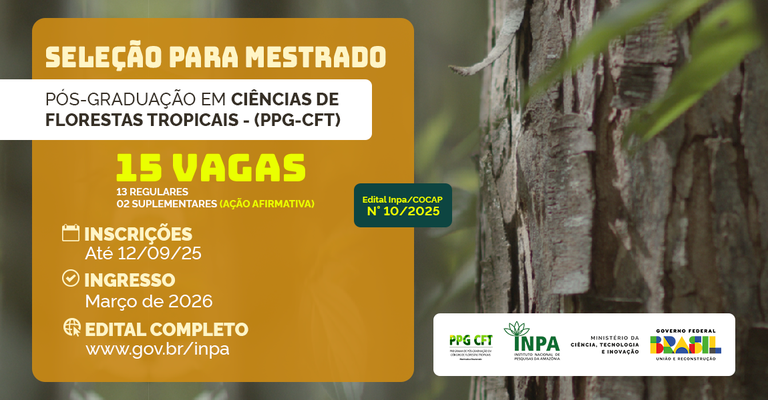 Instituto Nacional de Pesquisas da Amazônia (Inpa/MCTI) divulgou o Edital nº 10/2025 para o processo seletivo de mestrado do Programa de Pós-Graduação em Ciências de Florestas Tropicais (PPG-CFT), com início do curso previsto para março de 2026. As inscrições começaram no dia 11 de agosto e seguem até 12 de setembro de 2025, até às 23h59min (horário de Brasília).