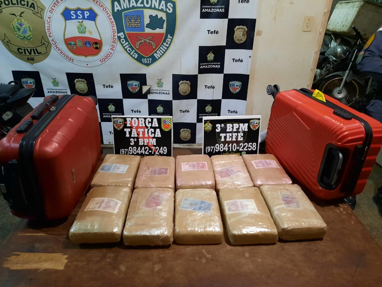 Um total de 16,106 quilos de entorpecentes, maconha tipo skunk, foram encontrados e apreendidos pelos policiais militares do 3˚ Batalhão de Polícia Militar de Tefé, distante 522 quilômetros de Manaus, em duas malas de viagem, que estavam em uma embarcação tipo lancha, que faz linha de Japurá para o município de Tefé.