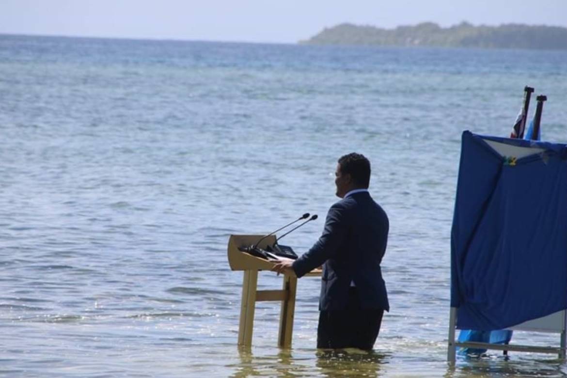 Meio Ambiente – Para fazer uma declaração impactante sobre a ameaça das mudanças climáticas, o ministro das Relações Exteriores de Tuvalu fez isso como nenhum outro – falando atrás de um púlpito em águas no mar.