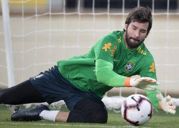 O goleiro Alisson que sofreu uma lesão logo após a conquista do título sul-americano, comemora o seu retorno para a ...