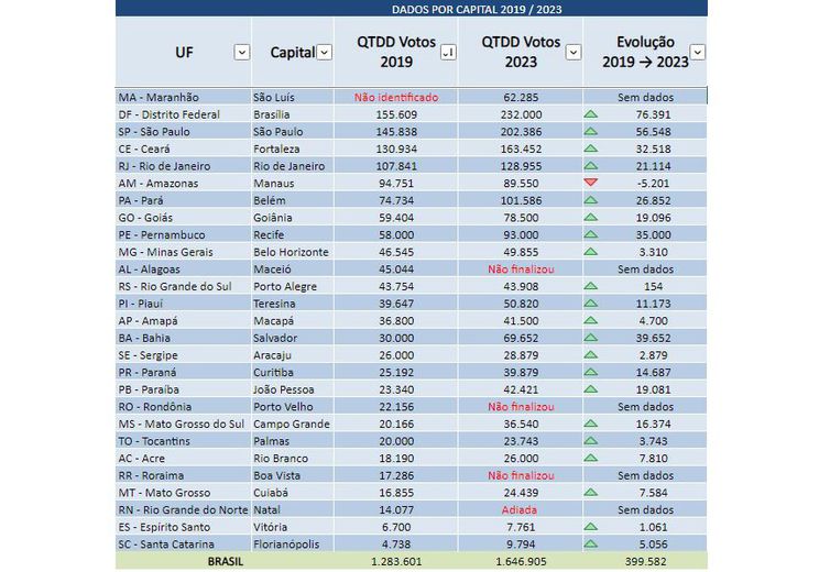 Entre as capitais com mais participação estão Salvador, Florianópolis, Brasília e São Paulo. Na capital baiana, o aumento foi de 30 mil para mais de 69 mil votos.