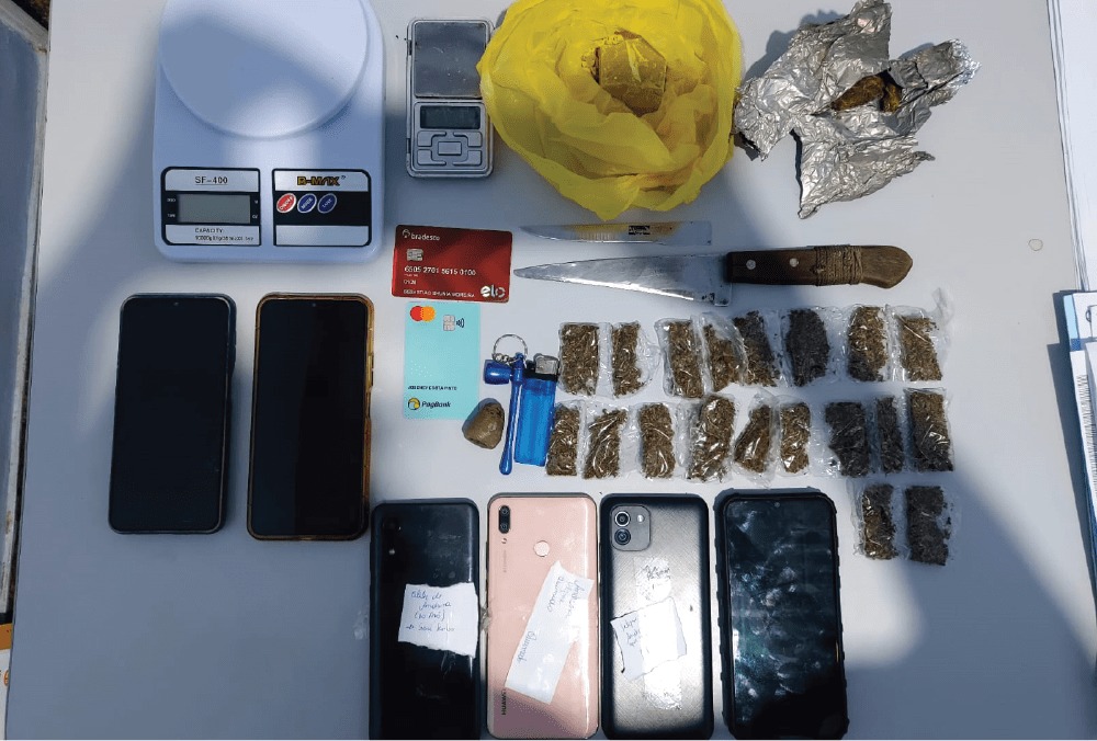 Conforme a delegada, durante o cumprimento dos mandados, foram apreendidas pasta base de cocaína, porções de maconha, aparelhos celulares, balança de precisão, facas, 500 reais em espécie e entre outros objetos.