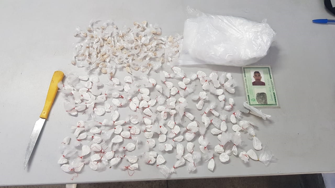 Ao ser indagado onde ele residia, o mesmo levou a guarnição até sua casa, sendo encontrado entre o forro e o telhado uma bolsa 123 trouxinhas de cocaína; 89 trouxinhas de oxi; 1 faca de mesa; 1 pacote de sacolas plásticas para embalo de entorpecentes.