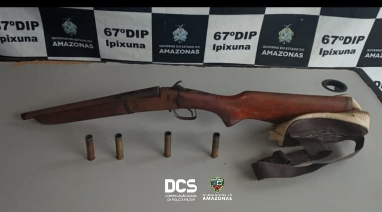 Um homem de 22 anos foi detido na rua José Lemos, município de Ipixuna (a 1.367 quilômetros da capital). A guarnição recebeu uma denúncia anônima informando que o infrator estava ameaçando uma mulher com uma arma de fogo. A equipe foi até o local e constatou que o infrator estava em posse de uma espingarda calibre 32. Ele foi conduzido para o 67° DIP.