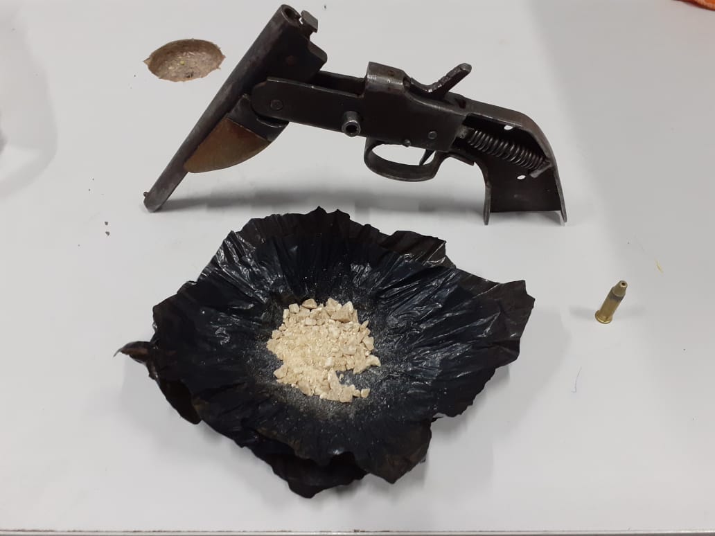 Os policiais receberam denúncia via 190, por volta das 3h, informando que um indivíduo estaria portando uma arma de fogo, ameaçando e perturbando os vizinhos, em uma residência localizada na rua Amarelinho. Ao chegar ao local, a equipe logo visualizou o suspeito portando uma arma de fogo de fabricação caseira. Após abordagem, durante buscas no interior da residência, foi encontrada uma porção de possivelmente cocaína.
