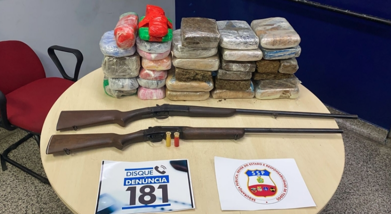 Ao chegar no local, os policiais encontraram 32 tabletes de cocaína e duas espingardas calibres 16 e 20.