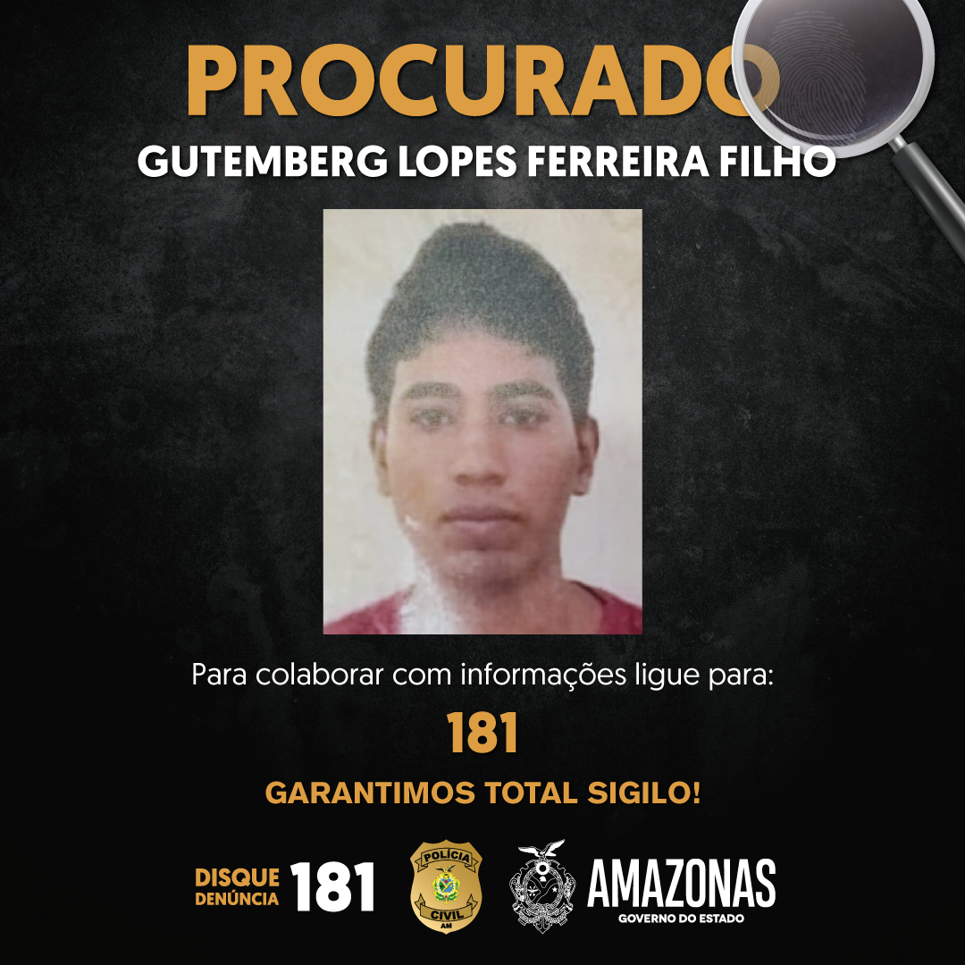 A Polícia Civil do Amazonas (PC-AM), por meio da delegada Marília Campello, adjunta da Delegacia Especializada em Homicídios e Sequestros (DEHS), solicita a colaboração de todos na divulgação da imagem de Gutemberg Lopes Ferreira Filho, conhecido como ‘Jr’, apontado como um dos autores do homicídio de Robson Gama da Silva, de 36 anos.