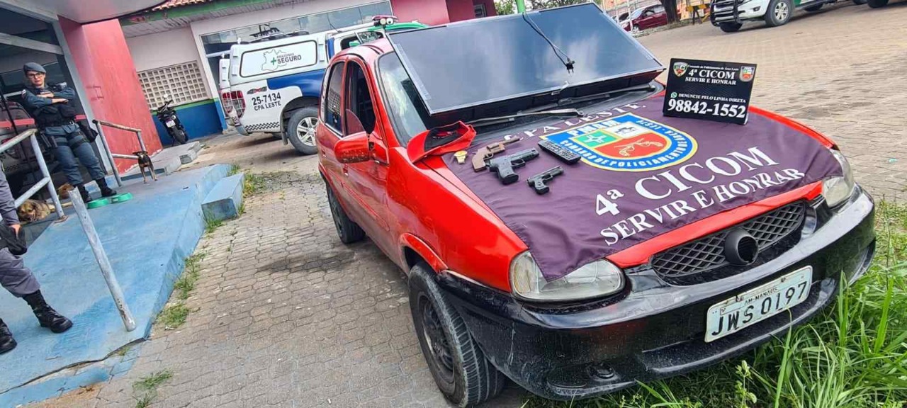 No local, a vítima informou aos policiais que fora agredida pela dupla de suspeitos, que depois fugiram num carro levando seu aparelho de televisão de 49 polegadas e aparelhos celulares. Os policiais iniciaram um cerco, e policiais da viatura 7134 realizaram abordagem ao veículo, ocupado por um homem de 26 anos e adolescente de 16, na rua Barreirinha, já no bairro Nova Vitória.
