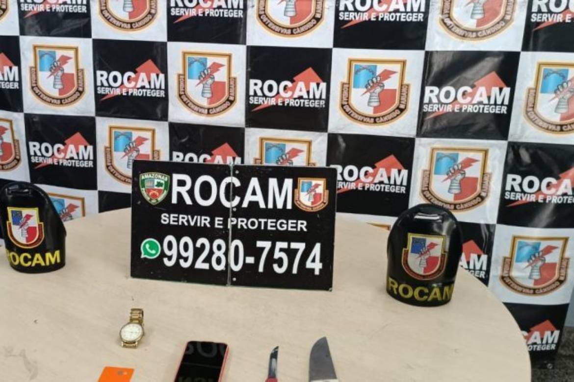 A equipe policial identificou o ônibus e avistou o assaltante fugindo para uma área de mata nas proximidades. Ele foi capturado com duas facas, um celular e um relógio subtraídos de passageiros do coletivo.