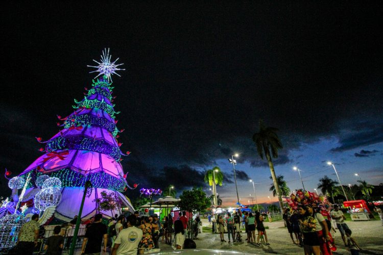 Em continuidade à programação do “Natal do Abraço”, da Prefeitura de Manaus, mais uma grande árvore foi entregue à população da capital. Nesta terça-feira, 8, foi a vez do complexo turístico da Ponta Negra, na zona Oeste, receber as cores e o brilho da campanha natalina. De autoria do artista plástico parintinense Juarez Lima, a árvore é a maior dessa edição, com 35 metros de altura e 15 metros de largura em sua base e foi acesa às 18h.