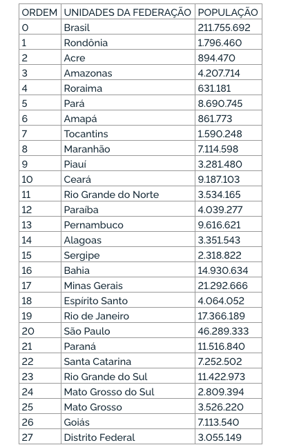 O Distrito Federal já conta com uma população de 3.055.149 habitantes. Roraima é o estado com a menor estimativa populacional (631.181).