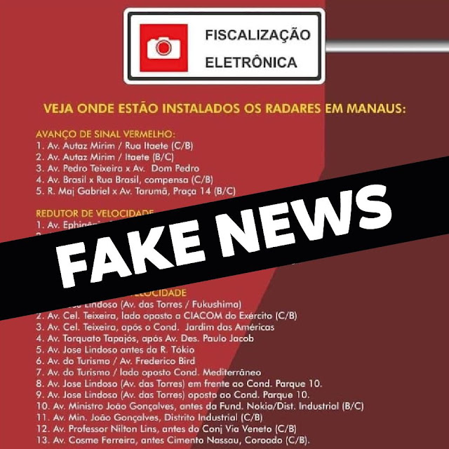 A Prefeitura de Manaus e o Instituto Municipal de Mobilidade Urbana (IMMU) esclarecem que a lista de pontos de radares eletrônicos que tem sido compartilhada nas redes sociais, datada de 2014, não é mais aplicável para o ano de 2024 e, portanto, trata-se de informação incorreta. Tal lista está sendo erroneamente compartilhada em grupos de aplicativos de mensagens e redes sociais e já foi categorizada como fake news.