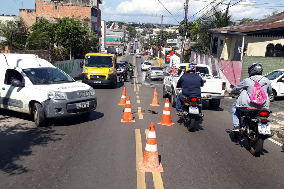 A Prefeitura de Manaus, por meio do Instituto Municipal de Mobilidade Urbana, interditou temporariamente, na tarde desta segunda-feira, 21/6, a rua Valério Botelho de Andrade no cruzamento com a rua Carvalho Paes de Andrade, bairro São Francisco, zona Sul. O fechamento da via é necessário para que a empresa Águas de Manaus realize um reparo emergencial de uma tubulação que rompeu e causou um afundamento no asfalto.