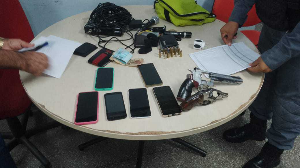 Com o grupo, foram encontrados um revólver calibre 38, um simulacro de revólver, 17 munições de calibre 38 e vários aparelhos celulares. Os homens foram conduzidos para o 14º Distrito Integrado de Polícia (DIP).