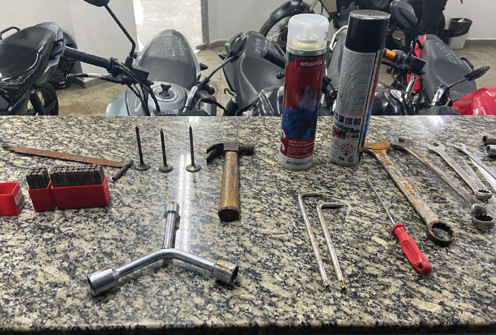 Além das motocicletas, também foram apreendidos diversos objetos pertencentes a ‘Dubai’, utilizados para adulterar veículos furtados. No momento da abordagem, Pedro e Edenilson estavam em posse de uma quarta motocicleta, usada nos crimes e que apresentava placa adulterada. Diante disso, ambos também foram presos pelo crime de adulteração de sinal identificador de veículo automotor.