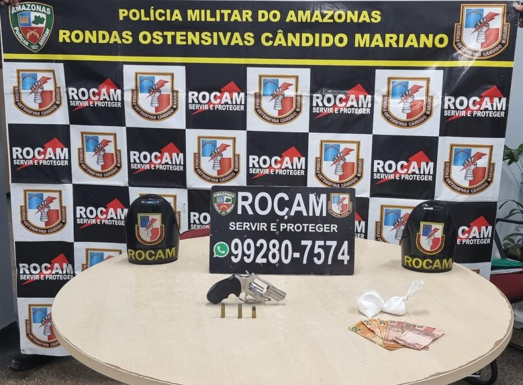 Policiais militares das Rondas Ostensivas Cândido Mariano (Rocam) detiveram, na madrugada deste sábado (11/12), um indivíduo de 37 anos, encontrado em posse ilegal de uma arma de fogo e de entorpecentes, no bairro São José, na zona leste.