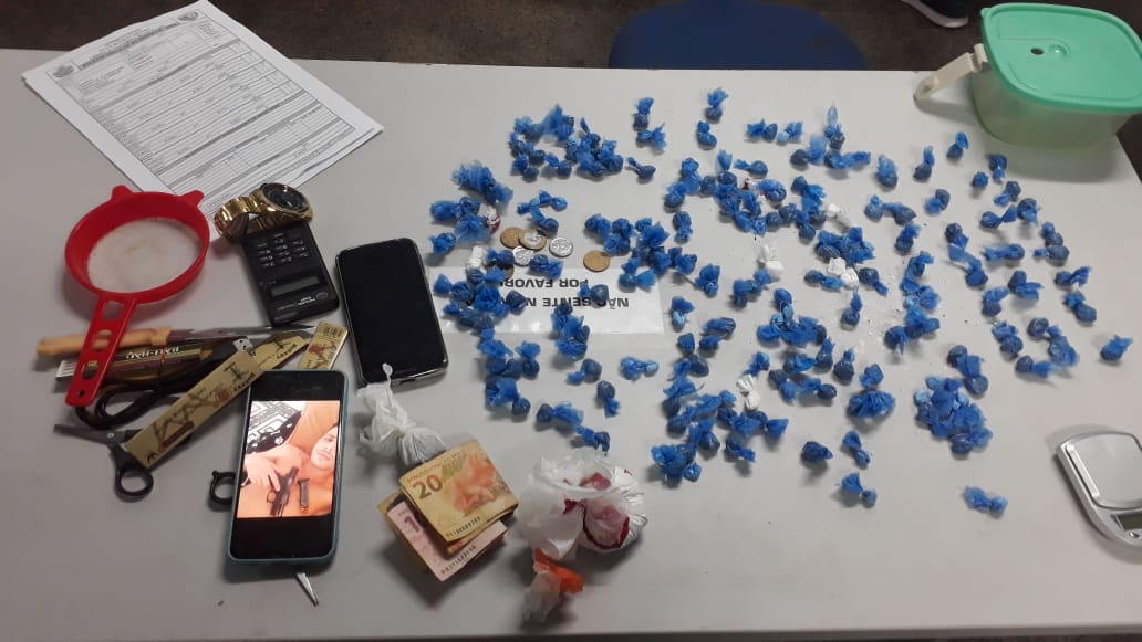Segundo informações dos policiais que atenderam a ocorrência, durante patrulhamento pelo bairro, foram avistados dois indivíduos em atitude suspeita, em via pública. Após abordagem e revista, foram apreendidos com os indivíduos 136 porções supostamente de maconha, 31 porções supostamente de cocaína, uma porção grande supostamente de maconha, uma balança de precisão, uma máquina de cartão e a quantia de R$ 112 em espécie.