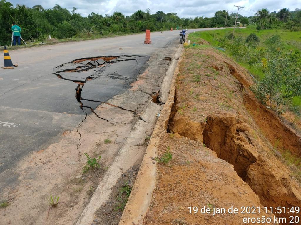 A rachadura devido ao rompimento de um bueiro antigo, com mais de 20 anos, causando desbarramento na lateral e afundamento da via, foi identificada há cerca de 25 dias pela Seinfra, que imediatamente determinou a recuperação do trecho, evitando que a via desabasse. Parte da estrada no Km 30 foi interditada e os veículos estão transitando por meio de um desvio lateral, devidamente sinalizado.