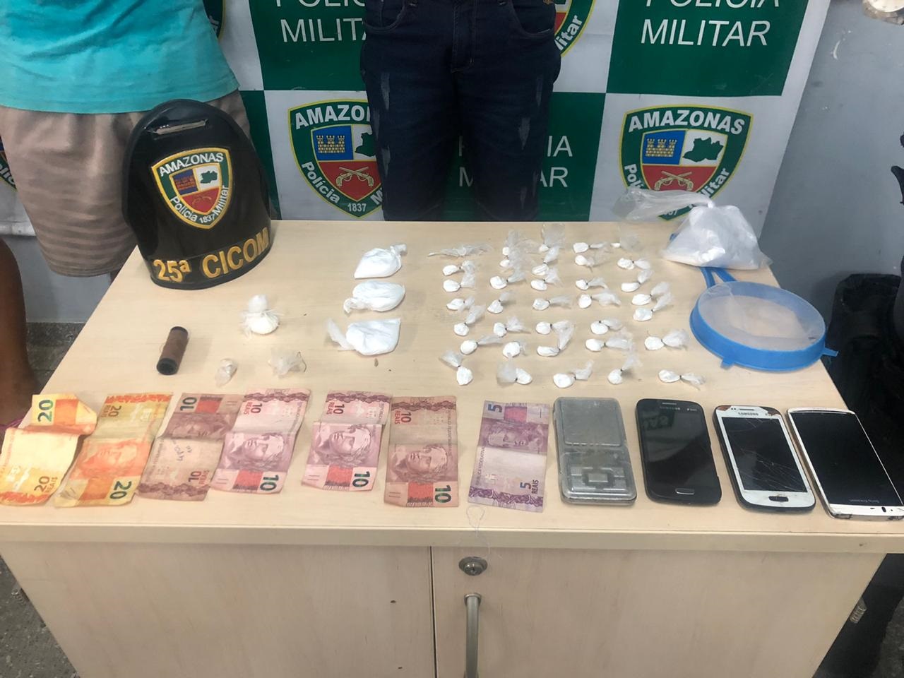 Ao ser realizada a abordagem e revista policial, foi encontrado em posse dos mesmos: 35 trouxinhas de entorpecente, supostamente cocaína; 3 porções grandes de supostamente cocaína; 2 “kits” de supostamente pasta-base de cocaína e oxy; R$ 85 em espécie; 1 balança de precisão; 3 celulares; 1 porção de cafeína para mistura e material para embalar entorpecentes.