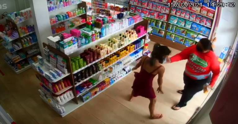 Câmeras de segurança da Drogaria Helena, localizada no bairro Morro da Liberdade flagou o momento em que duas jovens entraram na drogaria e tentam furtar medicamentos.